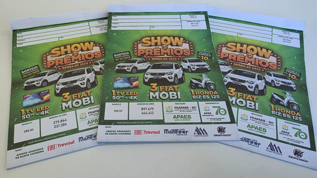 A APAE de Cocal do Sul já está com as cartelas do Show de Prêmios das APAEs de Santa Catarina 2025 disponíveis para venda. Cada bilhete custa R$ 10,00 e pode ser adquirido até o dia 28 de novembro, diretamente na Sede da APAE, localizada na Rua Ambrósio Dalló, nº 1464, Bairro União, ou ainda com os colaboradores da instituição.