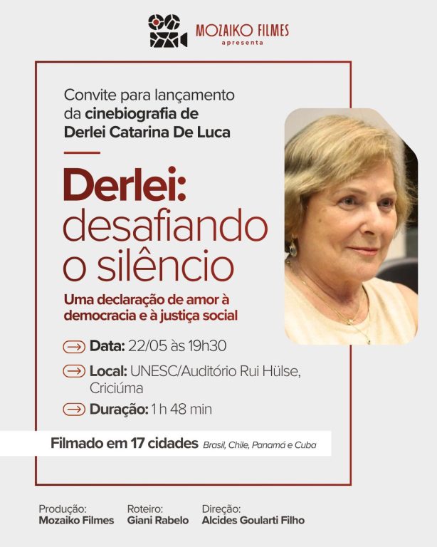 O Jornal da Guarujá conversou na manhã desta terça-feira (28) com o professor, pesquisador da Unesc e cineasta Alcides Goularti Filho, diretor do documentário Derlei: Desafiando o Silêncio, obra que reconstrói a trajetória de vida da militante içarense Derlei Catarina de Luca, reconhecida como uma das principais vozes catarinenses na denúncia das violações cometidas durante a ditadura militar brasileira.