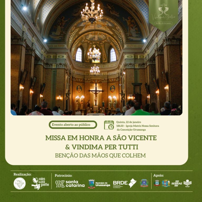 A programação da XVIII Vindima Goethe reserva um momento de fé, gratidão e tradição nesta quinta-feira (22), em Urussanga. A partir das 18h30, a Igreja Matriz Nossa Senhora da Conceição recebe a Missa em Honra a São Vicente, padroeiro dos viticultores, reunindo a comunidade local, produtores, visitantes e autoridades. Após a missa, às 19h30 será realizada a Vindima Per Tutti, evento aberto ao público no Salão Paroquial da Igreja.