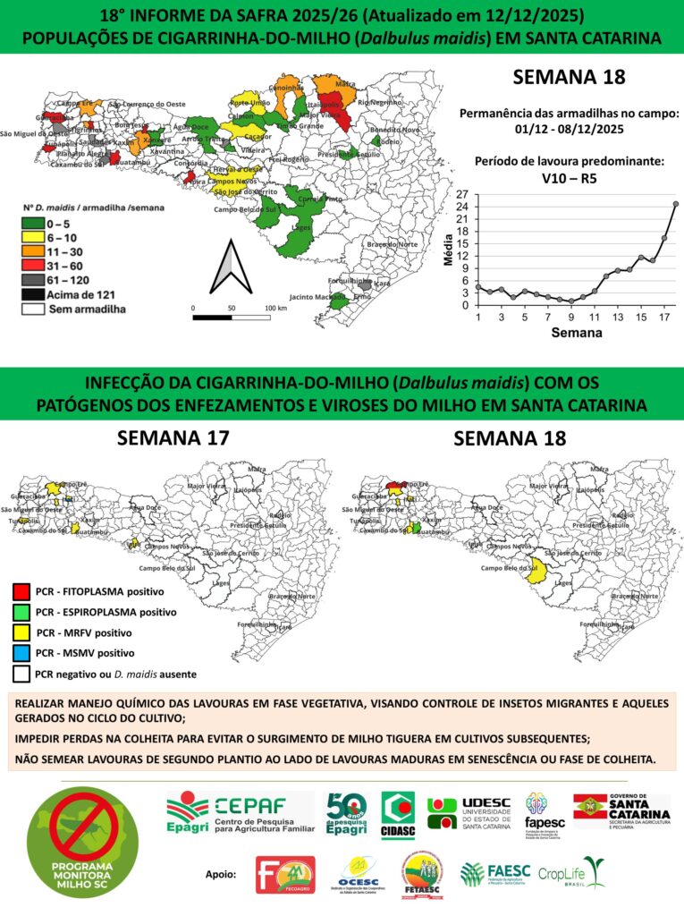 Santa Catarina apresenta elevação no índice populacional de cigarrinhas-do-milho, com média estadual de 25 animais por armadilha. Atualmente, a maioria das lavouras do estado se encontra em final do ciclo reprodutivo, quase pronta para a colheita. Este crescimento, segundo a pesquisadora da Epagri/Cepaf Maria Cristina Canale, responsável pelo Programa Monitora Milho SC, se deve, principalmente, à dificuldade de manejo durante as fases reprodutiva e de enchimento de grãos. Ela tranquiliza os agricultores ao afirmar que “a infecção nesse estágio não representa riscos à produção porque os patógenos, tanto dos enfezamentos como das viroses, têm menos tempo de contato com a planta para causarem danos severos”. As regiões Oeste e Extremo-Oeste seguem apresentando recorrência dos patógenos causadores dos enfezamentos e viroses.