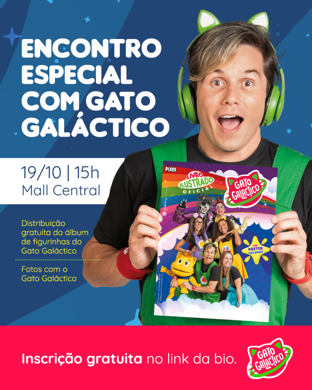 O Gato Galactico reúne pequenos fãs por onde passa, e agora é a vez do Farol Shopping ser palco de um encontro especial. No dia 19 de outubro, às 15h, Ronaldo Souza, criador do personagem, estará no mall central para uma tarde divertida com distribuição gratuita do álbum de figurinhas do Gato Galactico e fotos com o autor.