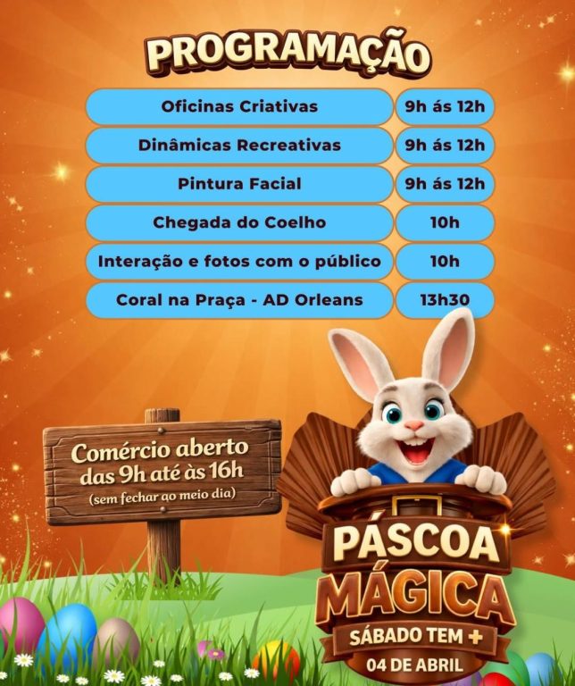 A Câmara de Dirigentes Lojistas (CDL) de Orleans já deu início aos preparativos para um dos momentos mais aguardados pelo comércio e pelas famílias da região. No sábado, dia 4 de abril, a cidade recebe a edição especial do Sábado Tem + “Páscoa Mágica”, prometendo movimentar o centro com atividades gratuitas e horário estendido.