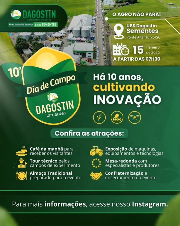 Turvo será palco de um dia inteiro de apresentação de inovações e tecnologias no setor agro. O 10º Dia de Campo Dagostin Sementes já tem data para acontecer. Será no dia 15 de janeiro e a programação foi pensada em detalhes para que todos os participantes tenham acesso ao maior número de informação possível. Iniciando com café da manhã às 7h30, o Dia de Campo segue com tour técnico; benção aos presentes; fala de autoridades; almoço; mesa redonda e happy hour de encerramento. Especificamente, sobre a mesa redonda a programação é bem ampla, com a participação do professor Antônio Mendes de Oliveira Neto, do professor Aldo Merotto Junior, do engenheiro agrônomo Júlio Marcos Catoni e do extensionista da Epagri Douglas Oliveira. O tema central é: Manejo Inteligente, o Segredo para Altas Produtividades, com as seguintes discussões: Competição inicial; Manejo e resistência; Novas tecnologias e Manejo de água. Além das atrações técnicas, os participantes contarão ainda com exposição de máquinas e equipamentos agrícolas. “Com certeza será um dia de grandes aprendizados e disseminação de conhecimento. Estamos preparando tudo com muita dedicação e contamos com a participação de todos”, destaca o proprietário da Dagostin Sementes, Rogério Dagostin. Entre as empresas que estarão no evento, é possível citar os patrocinadores: Menegaro, Januário, Sabmaq, Agrosul Agroparts e Drones, Campo Ar, Sicredi, FMC, Anysort e Basf, além do apoio da Prefeitura Municipal de Turvo.