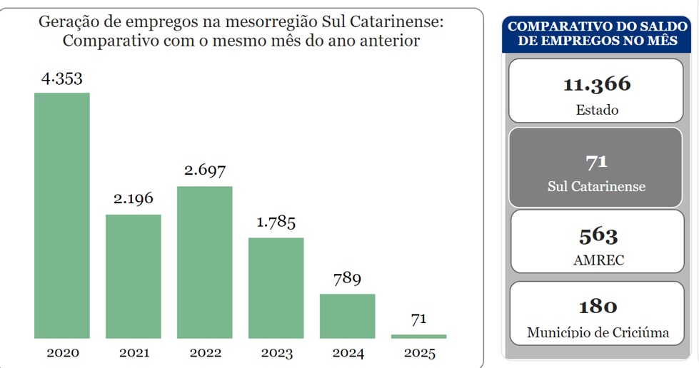 O baixo desempenho da mesorregião em setembro não reflete os números da Região Carbonífera, que fechou o mês com 563 empregos formais acrescentados, superando o saldo de 2023 (464) e o de 2024 (438).