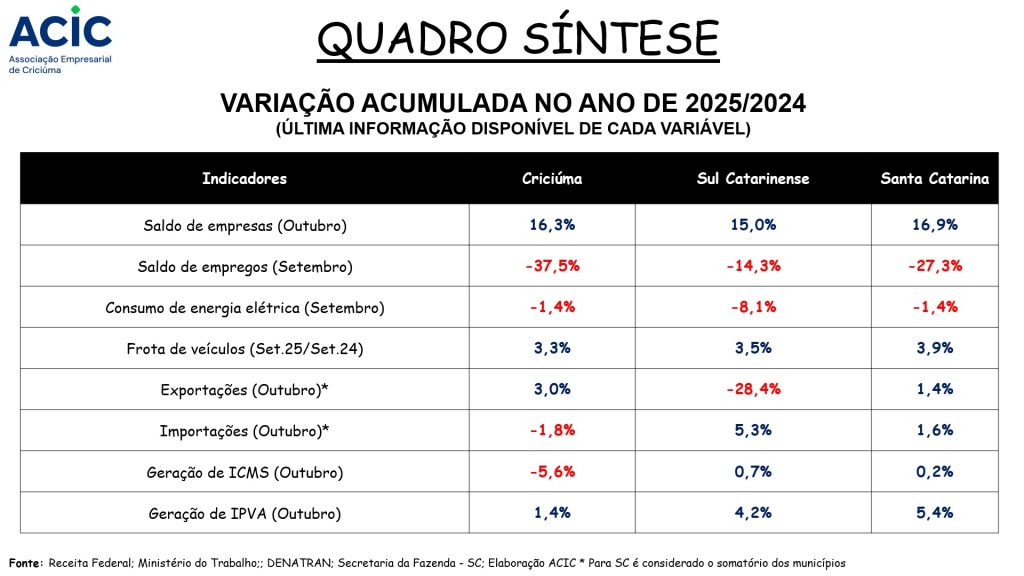 Elaborado com base em dados oficiais e disponibilizado pela Associação Empresarial de Criciúma (Acic), o Boletim de Conjuntura Econômica de novembro revela que o Sul catarinense mantém um cenário econômico de crescimento moderado em 2025. A mesorregião apresenta variações positivas em relação ao ano passado, mas também tem recuos e desempenho inferior à média estadual.