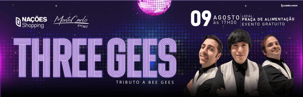 Como parte da programação do Dia dos Pais, o shopping recebe neste sábado (9), às 17h, um show gratuito com a banda argentina Three Gees, cover oficial dos Bee Gees. O espetáculo será realizado na Praça de Alimentação e promete reviver os grandes sucessos do trio britânico que marcou gerações.
