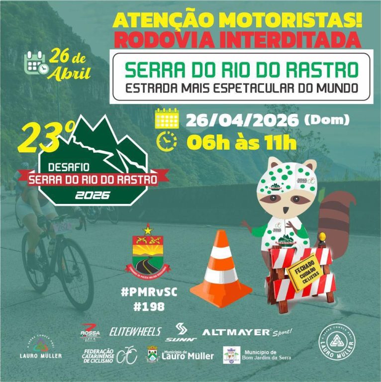 Durante a realização da prova, a rodovia SC-390 terá interdição temporária no trecho entre Lauro Müller e Bom Jardim da Serra, das 6h às 11h, medida necessária para assegurar a segurança dos participantes e o bom andamento do evento.