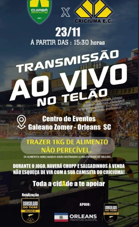 A cidade de Orleans terá programação especial neste domingo (23) para acompanhar o decisivo confronto entre Cuiabá e Criciúma, válido pela última rodada da Série B. A partir das 15h30, torcedores poderão assistir ao jogo em um telão instalado no Centro de Eventos Galeano Zomer.