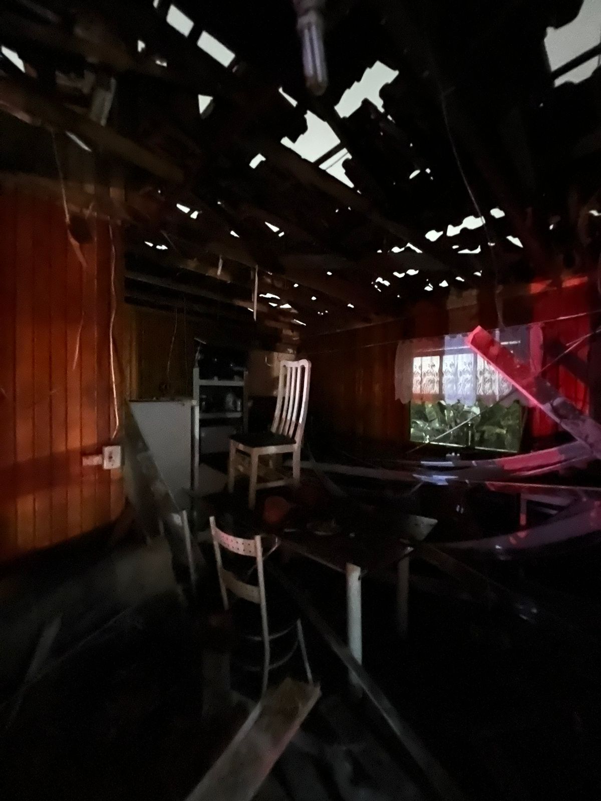 Ao chegarem no local os bombeiros encontraram o andar superior da residência parcialmente destruído devido a uma descarga atmosférica (raios).