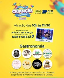 Além das atividades infantis, haverá área gastronômica para os adultos, com opções de hambúrguer, espetinho e chopp. “Para os pais, haverá também gastronomia paga, mas para a criançada tudo será gratuito”, completou Bratti.