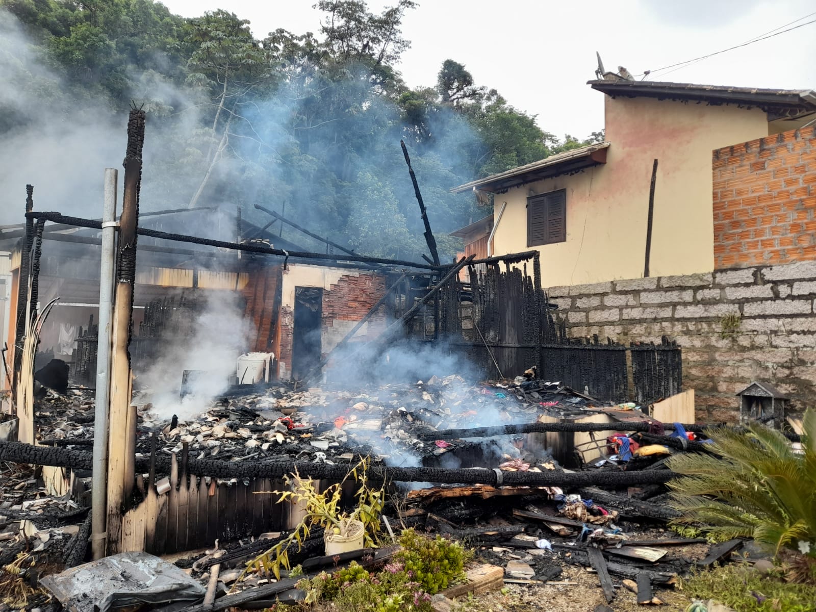 Os bombeiros conseguiram conter as chamas da residência e evitar que o incêndio atingisse a moradia ao lado e o galpão.