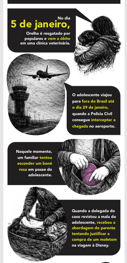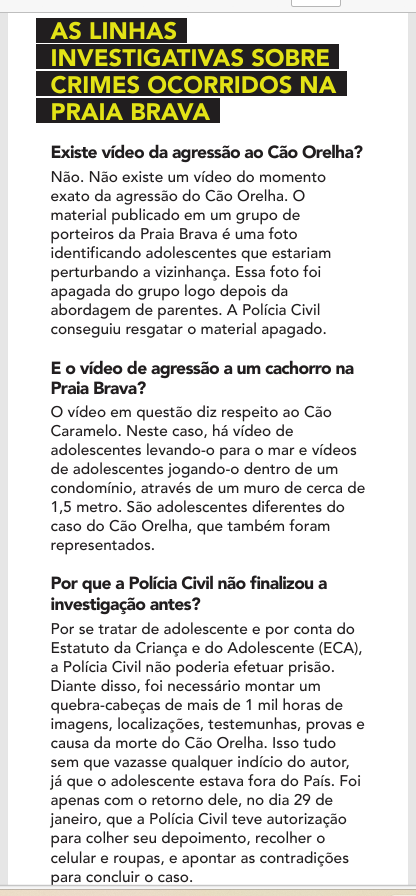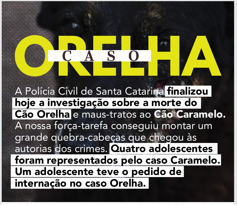 A Polícia Civil de Santa Catarina finalizou, nesta terça-feira, 3, a investigação sobre a morte do Cão Orelha e maus-tratos ao Cão Caramelo, em Florianópolis. Para chegar à autoria dos crimes, foi montada uma força-tarefa que envolveu as forças de segurança do Estado. Quatro adolescentes foram representados pelo caso Caramelo e um adolescente teve o pedido de internação no caso Orelha. Além disso, no caso Orelha, foram indiciados três adultos por coação a testemunha. As investigações foram conduzidas pela Delegacia Especializada no Atendimento de Adolescentes em Conflito com a Lei (DEACLE) e pela Delegacia de Proteção Animal (DPA), ambas da Capital.