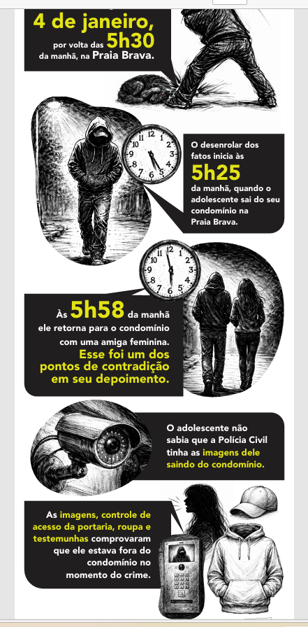 O desenrolar dos fatos começou às 5h25 da manhã, quando o adolescente saiu do condomínio na Praia Brava. Às 5h58 da manhã, ele retornou para o condomínio com uma amiga feminina. Esse foi um dos pontos de contradição em seu depoimento. O adolescente não sabia que a Polícia possuía as imagens dele saindo do local e disse que havia ficado dentro do condomínio, na piscina. Além das imagens, testemunhas e outras provas também comprovaram que ele estava fora do condomínio.
