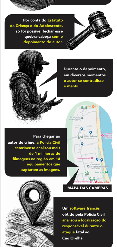 Para chegar ao autor do crime, a Polícia Civil analisou mais de 1 mil horas de filmagens na região, em 14 equipamentos que captaram imagens. Foram 24 testemunhas ouvidas, 8 adolescentes suspeitos investigados, além de provas como a roupa utilizada pelo autor do crime, que foi registrada em filmagens. Um software francês obtido pela Polícia também analisou a localização do responsável durante o ataque fatal ao Cão Orelha.