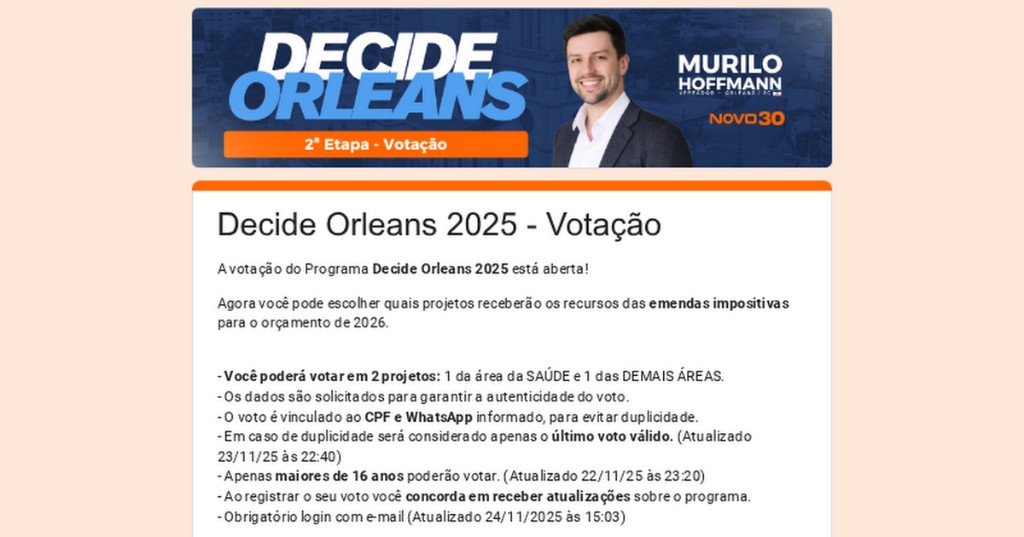 A votação já está aberta através do site: Decide Orleans 2025 – Votação