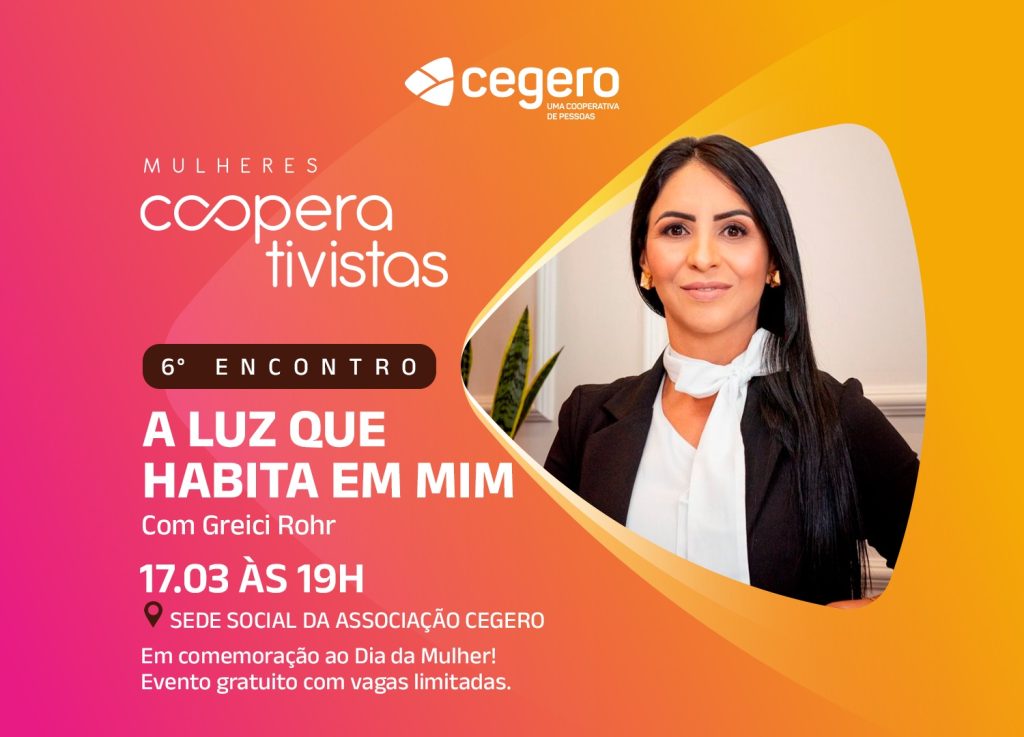 Com o tema “A luz que habita em mim”, a palestra abordará autoconhecimento, fortalecimento feminino e cooperativismo. O encontro é aberto a mulheres de diferentes faixas etárias e as vagas são limitadas. Faça sua inscrição aqui.