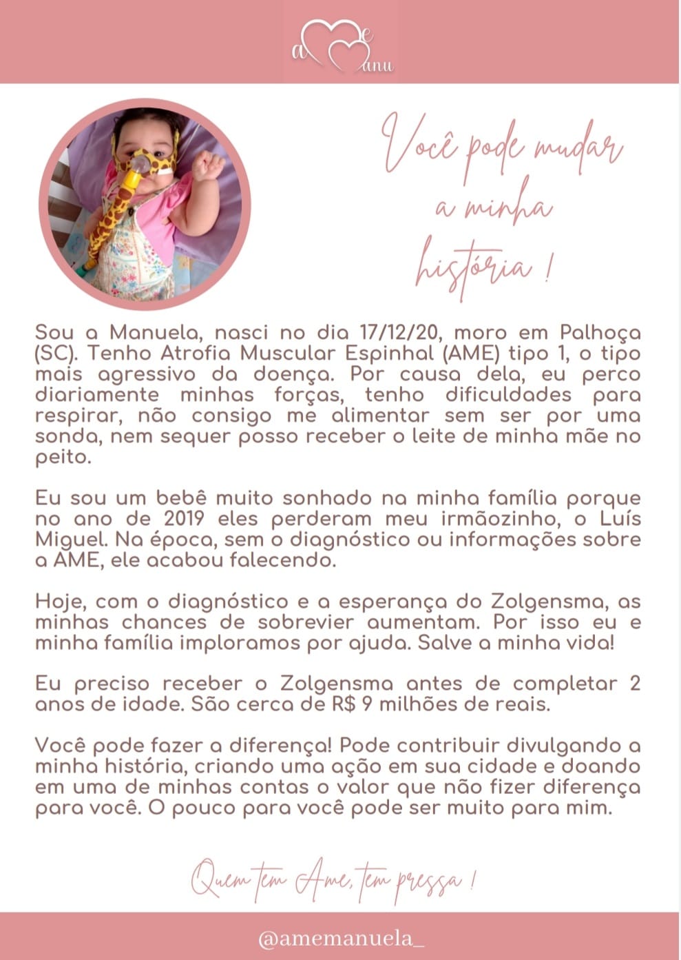 A menina Manuela Carvalho Standt, nasceu no dia 10 de dezembro de 2020 e aos dois meses e 19 dias de vida foi diagnosticada com Atrofia Muscular Espinhal (AME) tipo 1, o tipo mais agressivo da doença. Esse distúrbio causa perda de forças, dificuldades para respirar. Atualmente ela pode se alimentar somente por sonda. Zolgensma é o medicamento necessário para amenizar os sintomas da AME e custa aproximadamente R$ 9 milhões. Você pode contribuir para mudar a vida de Manuela.