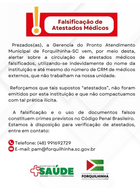 Prefeitura de Forquilhinha fez um alerta sobre o uso de atestados médicos falsos na cidade. A orientação é para que moradores e empresas fiquem atentos ao receber esse tipo de documento.