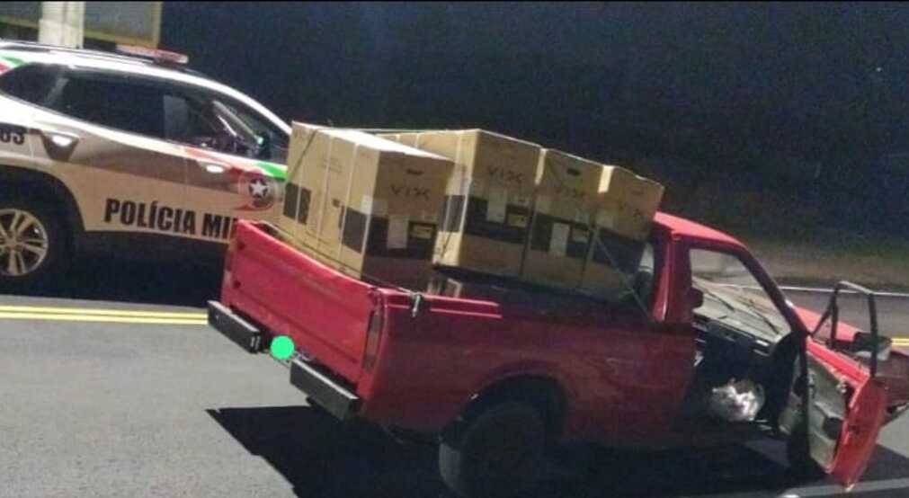 Ao chegar nas proximidades, os policiais avistaram um veículo Ford Pampa carregado com oito aparelhos de ar-condicionado novos, ainda acondicionados em caixas. No mesmo momento, os dois suspeitos entraram no veículo e fugiram pelas ruas da cidade. Após acompanhamento, a dupla foi abordada cerca de dois quilômetros adiante.