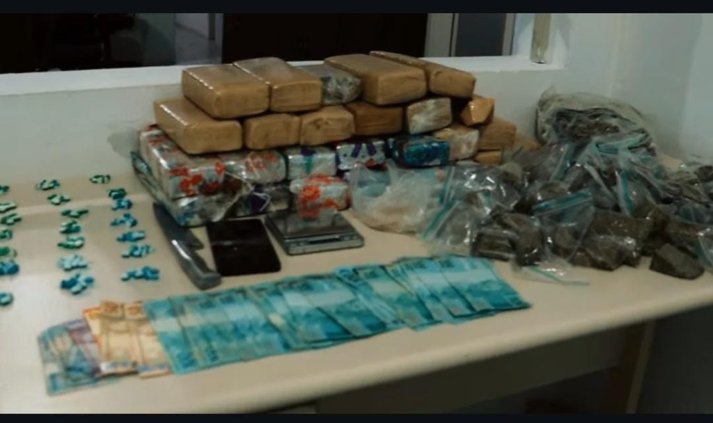 Na casa do suspeito, os policiais encontraram uma grande quantidade de entorpecentes. Ao todo, foram apreendidos 21,230 quilos de maconha, 59 gramas de MD, 294 comprimidos de ecstasy, 44 gramas de haxixe, 445 gramas de skank e R$ 2.544,00 em dinheiro.