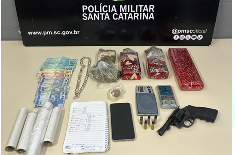 A Polícia Militar prendeu um homem de 25 anos por tráfico de drogas e posse de arma de fogo com numeração suprimida na tarde deste sábado (20), em Forquilhinha. A ocorrência foi registrada por volta das 16h19, na Rua Santa Bárbara.