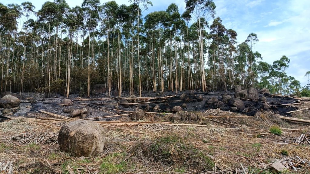 Na tarde desta segunda-feira (22), por volta das 13h23, o Corpo de Bombeiros foi acionado para combater um incêndio em vegetação de grande extensão no bairro Santa Apolônia, em Sangão. As chamas atingiram uma área de extração de eucalipto, com vegetação de médio e grande porte, e avançavam em direção a uma comunidade próxima, oferecendo risco a residências da região.