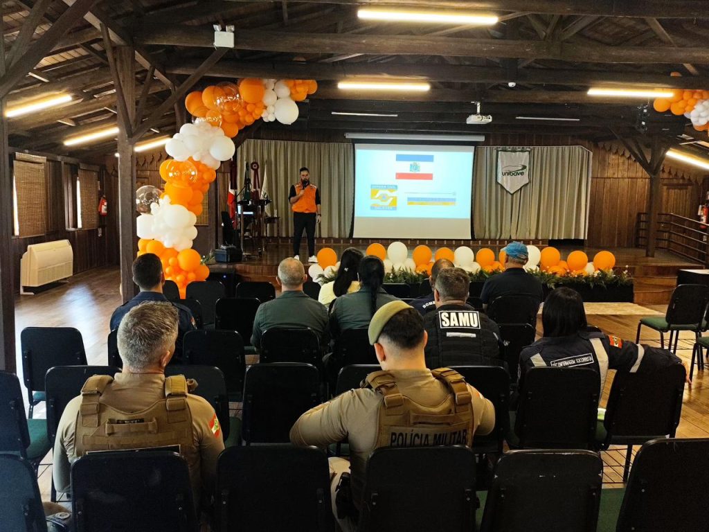 Em Orleans, o exercício aconteceu no Centro de Vivência do UNIBAVE e incluiu a ativação do Gabinete de Crise, mobilização das equipes, simulação de abertura de abrigo e organização do Centro de Logística (CELOG), além da aplicação prática dos protocolos previstos no Sistema de Comando em Operações (SCO).