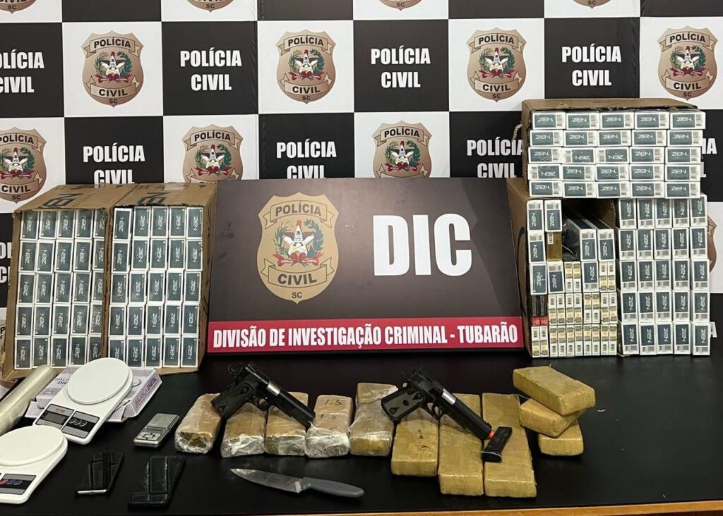 Durante as buscas, os policiais  apreenderam diversos tabletes de maconha, além de apetrechos utilizados no fracionamento e embalagem da substância e mais de 1.200 maços de cigarros contrabandeados do Paraguai foram encontrados. O homem foi encaminhado ao Presídio Regional de Tubarão.