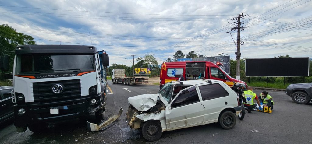 Um acidente envolvendo um caminhão, um carro e uma motocicleta deixou duas pessoas feridas na manhã desta quarta-feira, 12, por volta das 8h40, na SC-108, no bairro Murialdo, em Orleans. A colisão ocorreu em frente ao quartel do Corpo de Bombeiros.