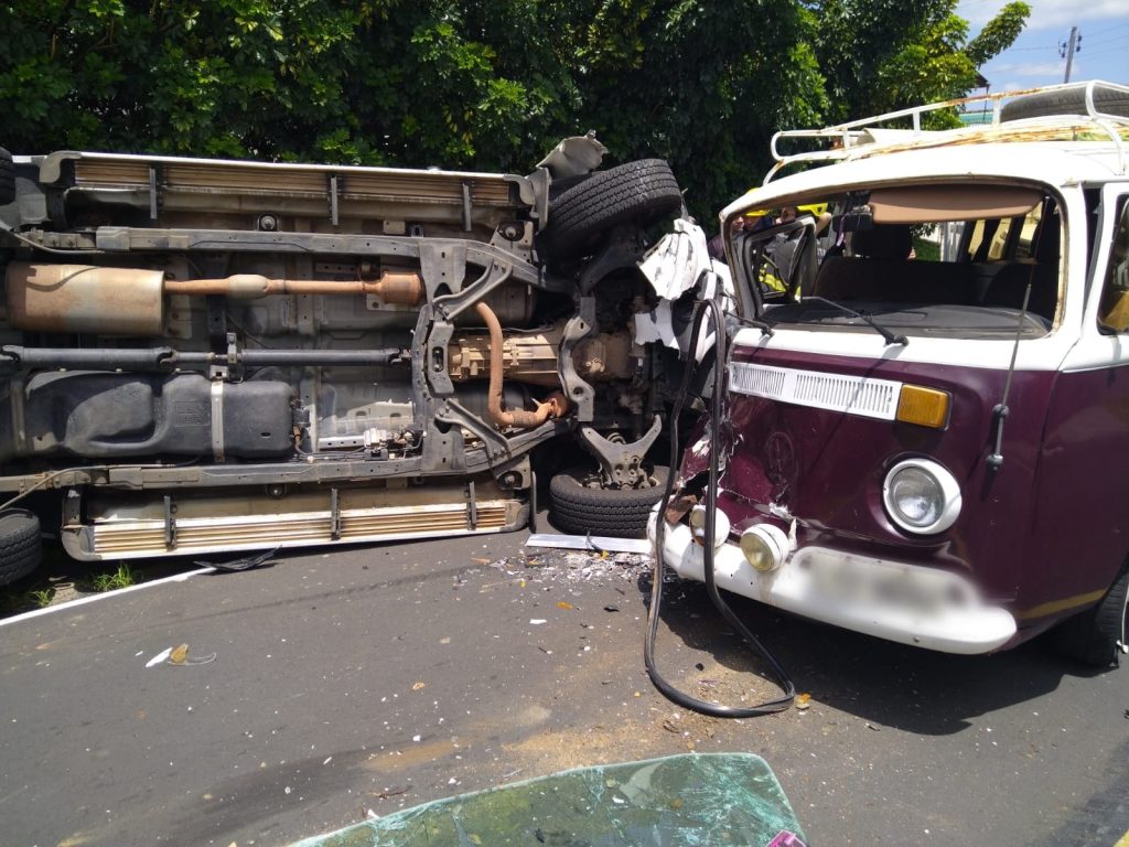 Com a batida entre uma caminhonete Chevrolet S-10 e uma Volkswagen Kombi, a caminhonete acabou capotando na via. O motorista da S-10, um homem de 48 anos, conseguiu sair do veículo sozinho e não se feriu.