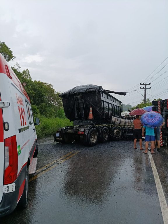 O motorista da carreta que permaneceu sobre a pista, um homem de 37 anos, foi retirado da cabine após o trabalho de desencarceramento. Ele estava consciente e orientado, mas apresentava possível fratura na perna direita, além de múltiplos cortes e lacerações. A vítima recebeu atendimento inicial no local, com apoio da ambulância básica do SAMU.