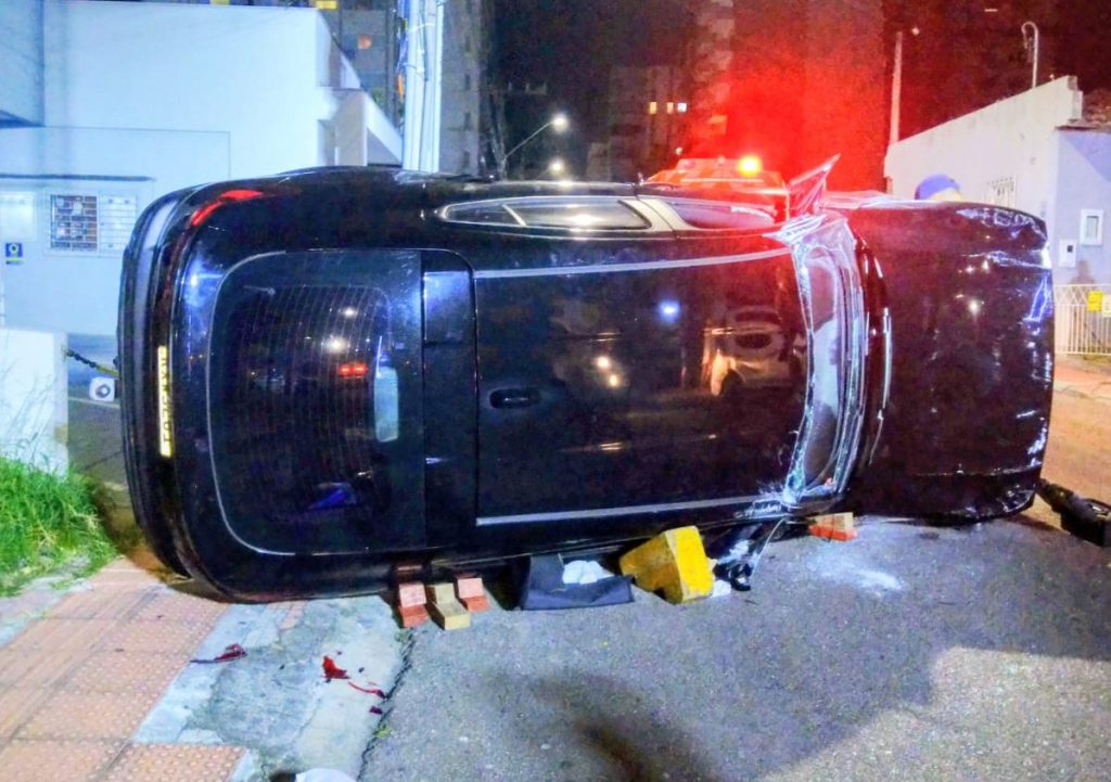 Um idoso de 69 anos dirigia um Fiat Fastback quando bateu em um Fiat Mobi que estava estacionado. Com o impacto, o carro capotou e ficou tombado na pista.