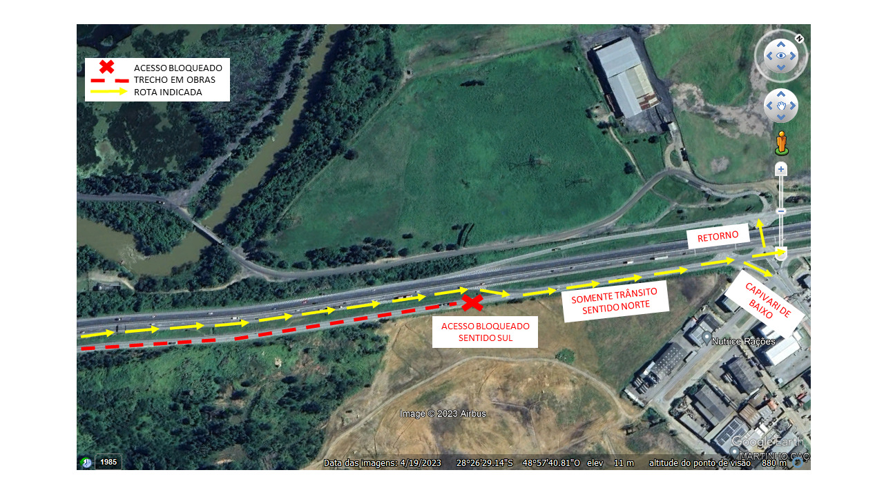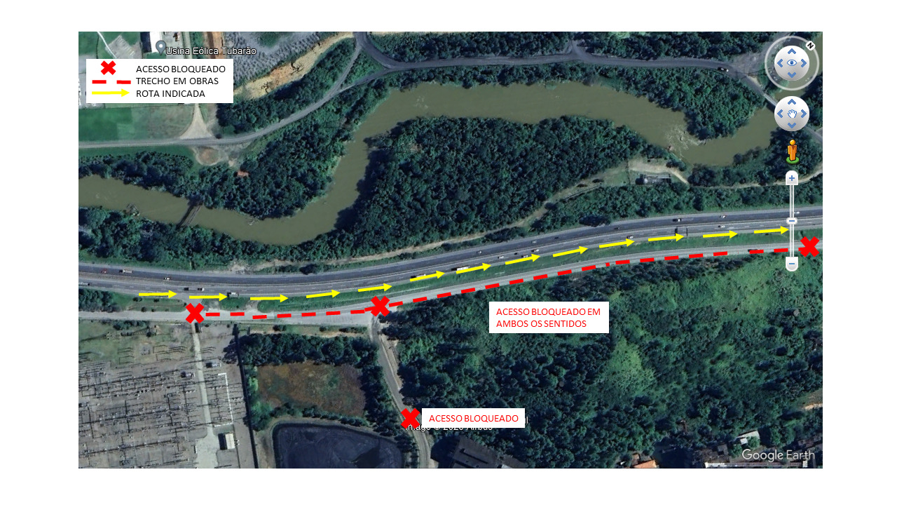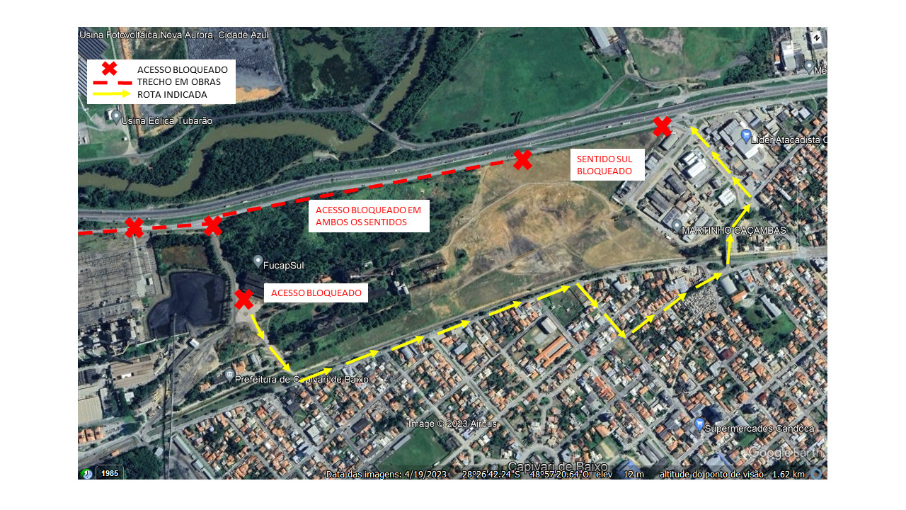 Durante o período de obras, veículos que trafegam pela rodovia e desejam acessar o município deverão seguir pela BR e utilizar o acesso principal no viaduto do km 328, que é o ponto principal de entrada ao município de Capivari de Baixo.