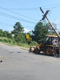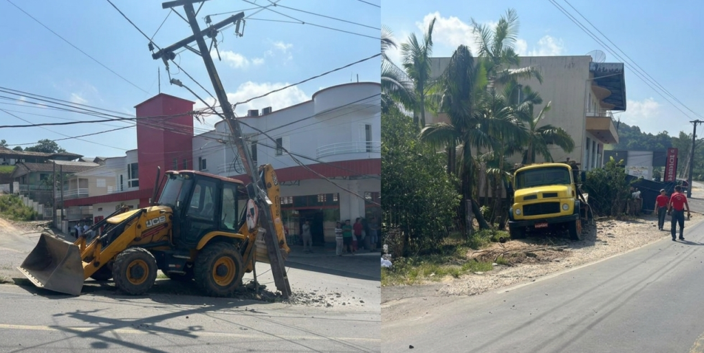 A retroescavadeira desceu de ré e bateu em um poste de energia, em frente a um supermercado. Ao mesmo tempo, o caminhão também começou a descer de ré. O motorista tentou frear, mas o freio não funcionou.