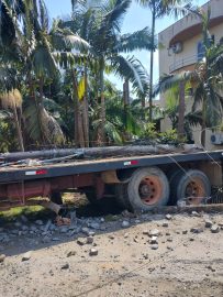 Segundo a Polícia Militar, um caminhão que transportava uma retroescavadeira subia a rua quando a máquina se soltou da carroceria. Isso aconteceu porque a cinta que prendia o equipamento se rompeu.